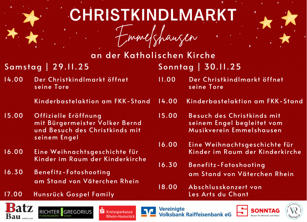Mit einem Glühwein in der Hand, umgeben vom sanften Glanz der Lichter und der zauberhaften Vorfreude der Adventszeit – auch in diesem Jahr lädt der beliebte Christkindlmarkt rund um die katholische Kirche und in den Räumen des Pfarrheims in Emmelshausen zum stimmungsvollen Beisammensein ein.